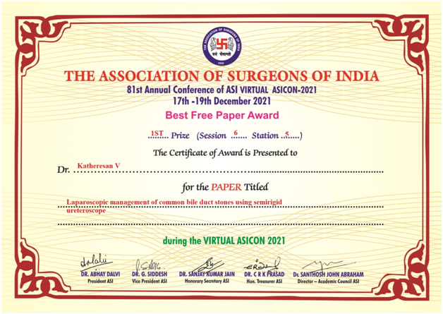 1. LAPAROSCOPIC MANAGEMENT OF COMMON BILE DUCT STONES USING SEMI RIGID URETEROSCOPY in AMASICON, ASICON.