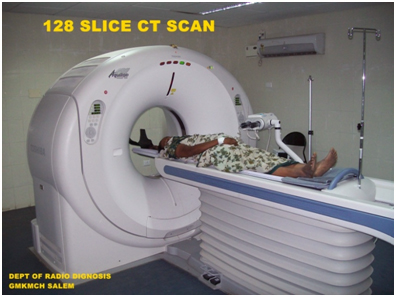 FIRST TIME in Tamilnadu 128 slice CT scan was installed in the Department of Radio diagnosis, GMKMCH Salem in the year 2011.Itprovides all types of CT angiogram studies to the patients high frequency 800mA x-ray unit with IITV was started in 2011 at Radio diagnosis department. Contrast procedure services are provided to the patients. Now an average 4 to 5 cases are done per day.