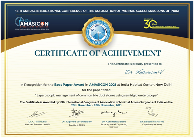 1. LAPAROSCOPIC MANAGEMENT OF COMMON BILE DUCT STONES USING SEMI RIGID URETEROSCOPY in AMASICON, ASICON.